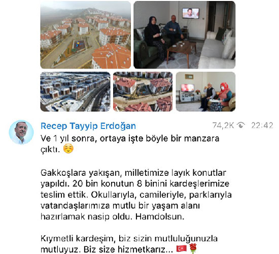 "Ve 1 yıl sonra ortaya işte böyle bir manzara çıktı. Gakkoşlara yakışan, milletimize layık konutlar yapıldı. 20 bin konutun 8 binini kardeşlerimize teslim ettik. Okulları, camileri ve parklarıyla vatandaşlarımıza mutlu bir yaşam alanı hazırlamak nasip oldu. Hamdolsun. Kıymetli kardeşim, biz sizin mutluluğunuzla mutluyuz. Biz size hizmetkarız..."