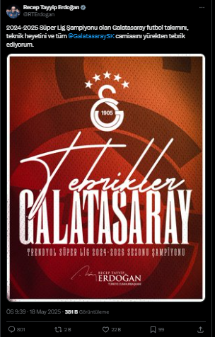 Cumhurbaşkanı Erdoğan, sosyal medya hesabından yaptığı paylaşımda, "2024-2025 Süper Lig Şampiyonu olan Galatasaray futbol takımını, teknik heyetini ve tüm Galatasaray Spor Kulübü camiasını yürekten tebrik ediyorum." ifadelerini kullandı.
