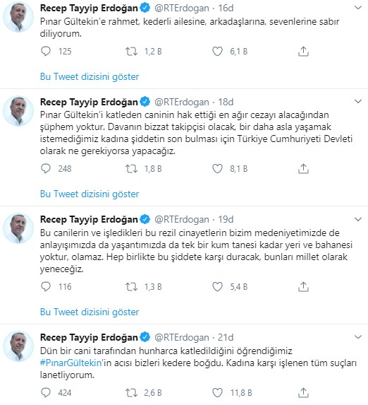 Cumhurbaşkanı Recep Tayyip Erdoğan, Pınar Gültekin'in öldürülmesine ilişkin Twitter hesabından bir paylaşımda bulundu.