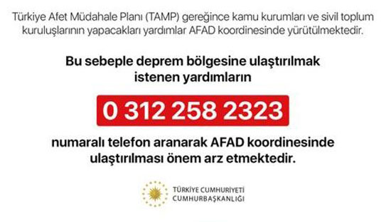 Cumhurbaşkanlığının resmi twitter hesaplarından yapılan paylaşımda, Türkiye Afet Müdahale Planı (TAMP) gereğince kamu kurumları ve sivil yardım kuruluşlarınca yapılacak yardımların AFAD koordinesinde yürütüldüğü hatırlatılarak, "Bu sebeple deprem bölgesine ulaştırılmak istenen yardımların '0 312 258 23 23' numaralı telefon aranarak AFAD koordinesinde ulaştırılması önem arz etmektedir" ifadeleri kullanıldı.