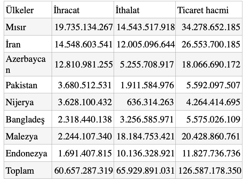 Türkiye, bu dönemde Mısır, İran, Azerbaycan, Pakistan ve Nijerya'yla yaptığı ticarette dış ticaret fazlası verdi. Anılan fazla, Mısır ile ticarette 5,2 milyar dolar, İran ile ticarette 2,5 milyar dolar, Azerbaycan ile ticarette 7,6 milyar dolar, Pakistan ile ticarette 1,8 milyar dolar ve Nijerya ile ticarette yaklaşık 3 milyar dolar olarak hesaplandı.