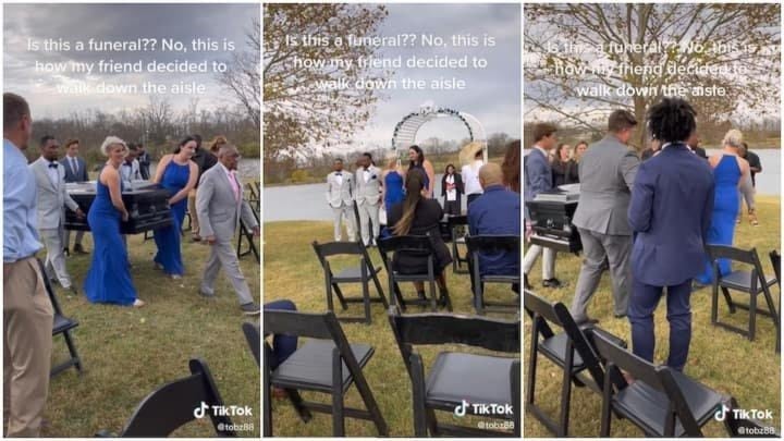 “tobz88” isimli bir kullanıcının yayınladığı görüntülerde bir açık hava düğünü görülürken, damadın “sansasyonel” bir şekilde törene katılması kafaları karıştırdı. Çok sayıda davetlinin katıldığı törende damat bir tabutun içerisinde getirildi.