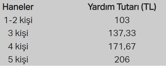 Aile ve Sosyal Hizmetler Bakanlığınca verilen destek miktarı arttı. Hanedeki birey sayısına göre verilen ve üst limiti 137,33 lira olan destek tutarı 206 liraya çıkarıldı.