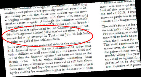 Tutanakların Türkiye açısından ilginç yanı ise 15 Temmuz’da yaşanan darbe girişiminin de belgede yer alması oldu. Tutanaklarda yer alan açıklamalarda gelişmekte olan ülke ekonomilerinin genel olarak pozitif seviyede olduğu belirtilirken, “15 Temmuz’da Türkiye’de gerçekleşen başarısız darbe girişiminin küresel piyasalar üzerindeki etkisi çok olmadı” ifadelerine yer verildi. Faiz artışına yönelik ise FOMC’nin büyüme, istihdam ve enflasyon görünüm konusunda güçlü bir konsensüse ulaşana kadar faiz konusunda bir adım atma taahhüdünde bulunmayacaklarına işaret edildi. Tutanaklarda, “Üyeler, seçeneklerini açık tutmaya devam etmenin ve politika duruşunun gelen veriler temel alınarak ayarlanması esnekliğinin sürdürülmesinin uygun olacağı kararına vardılar” denildi.
