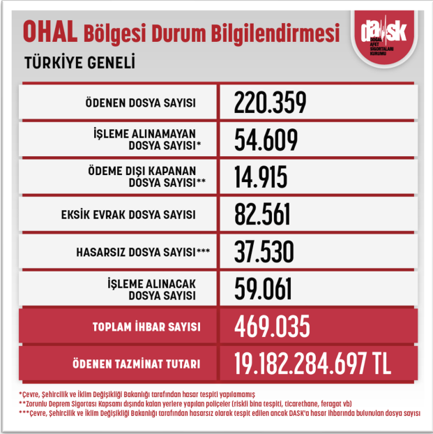 Açıklamaya göre, 17 Nisan 2023 tarihi itibarıyla 469.035 adet hasar ihbarı ulaşırken, tazminat ödeme tutarı ise 19 milyar TL'yi aştı.
