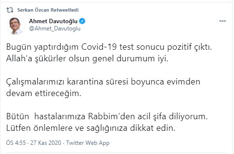 Kovid-19 testinin pozitif çıkmasına ilişkin sosyal medya hesabından paylaşımda bulunan Davutoğlu, "Bugün yaptırdığım Kovid-19 test sonucu pozitif çıktı. Allah'a şükürler olsun genel durumum iyi. Çalışmalarımızı karantina süresi boyunca evimden devam ettireceğim. Bütün hastalarımıza Rabbim’den acil şifa diliyorum. Lütfen önlemlere ve sağlığınıza dikkat edin" dedi.