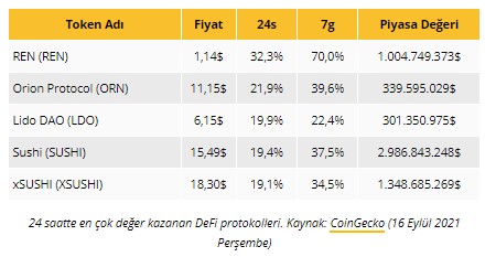 İkinci protokol ise yüzde 21,9 artış ile Orion Protocol (ORN) olarak kayda geçti. Orion Protocol (ORN) 11,15 dolardan işlem görüyor. Yüzde 19,9 oranında yükselen Lido DAO (LDO) protokolü 6,15 dolar seviyesinde.