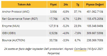 24 saat içinde merkeziyetsiz finans (DeFi) sektörünün gerileyen isimlerine baktığımızda, toplam piyasa değeri 451.062.710 dolar olarak hesaplanan ve yüzde 6,8 oranında gerileyen Anchor Protocol (ANC) protokolü 3,93 dolar olarak işlem görüyor.
