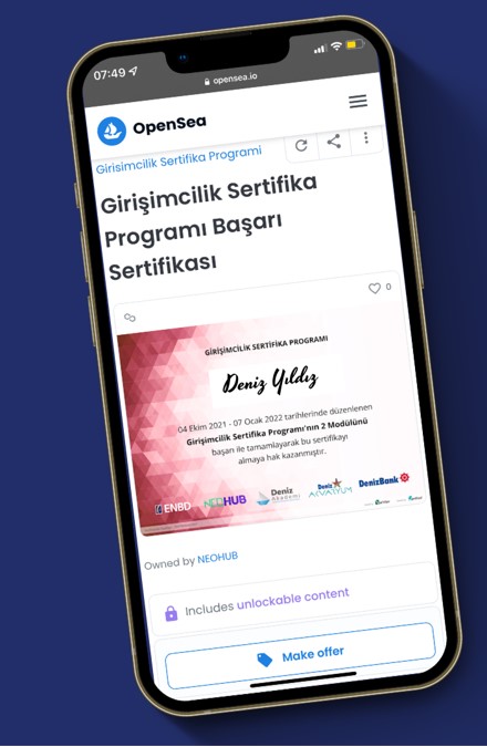 NEOHUB Genel Müdürü Gürhan Çam, konuyla ilgili yaptığı değerlendirmede, inovasyonu DNA’sında taşıyan bir kurum olarak bugüne kadar hep ekosistemin desteğini alıp, birlikte üretmenin ve büyümenin yollarına odaklandıklarını ifade ederek, “NEOHUB’ı, yurt dışına açılmayı hedefleyen start-up ve girişimcileri network ve deneyim bazlı desteklemek üzere geçtiğimiz yıl kurduk. Bu çatı altında, Bankamız bünyesinden çıkan ve kendi ayakları üzerinde durmak isteyen girişimcilerimizi yetiştirmek üzere de Deniz Akademi iş birliği ile Girişimcilik Sertifika Programımızı hayata geçirdik. Her zaman geleceğin teknolojilerine odaklanan bir kurum olarak, mezunlarımızın sertifikalarını NFT formatında dağıtmanın mutluluğunu yaşıyoruz. Son dönemde popülerleşen ve giderek daha da adını duyacağımız blokzincir (blockchain) teknolojisinin bizlere kazandırdığı NFT’ler (Non-Fungible Token), dijital bir varlığın özgün ve değiştirilemez şekilde saklanarak, transfer edilebilmesine olanak sağlıyor. Bu sayede 38 şanslı Denizcimiz, ömür boyu kaybolmayacak, hatta torunlarına miras bırakabilecekleri sertifikalarına kavuştular. NEOHUB olarak sektörümüze yön veren girişim ve yaklaşımlarımız ile girişimcilik ekosisteminin gelişimi için çalışmaya devam edeceğiz” dedi.