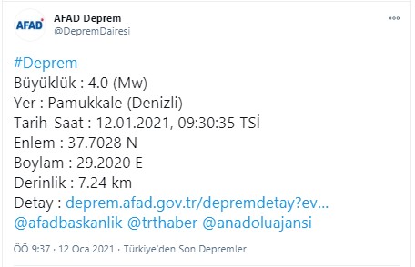 Afet ve Acil Durum Yönetimi Başkanlığının (AFAD) sitesinde yer alan bilgiye göre, Denizli'nin Pamukkale ilçesinde 4 büyüklüğünde deprem yaşandı.