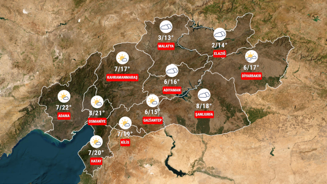 Hatay'da ise hava sıcaklıklarının bugün en düşük 7, en yüksek 20 derece derece olması bekleniyor.