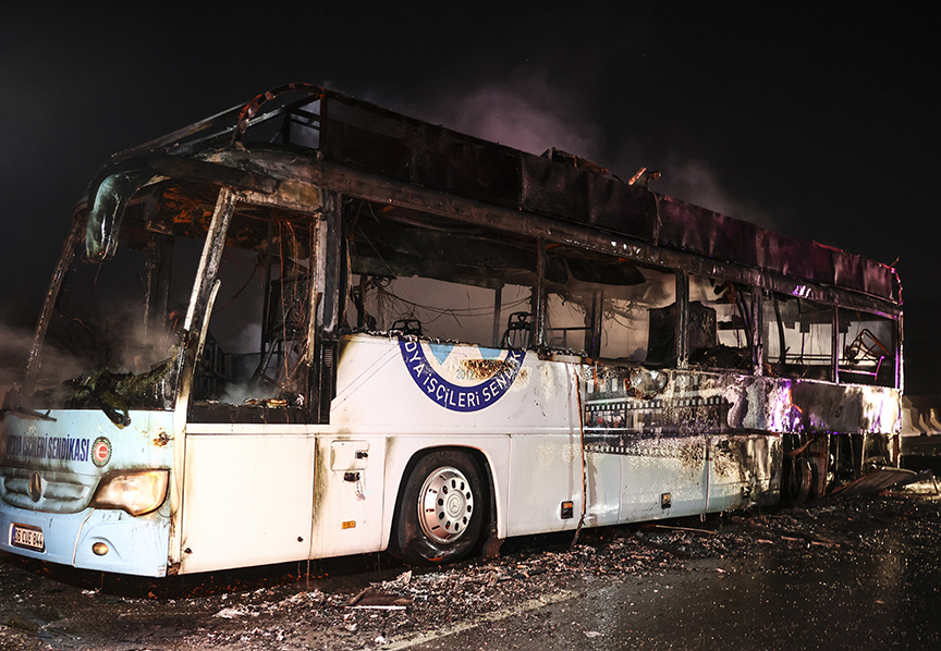 Sendika Genel Başkanı Sezai Ballı, Genel Başkan Yardımcıları Dilek Atçeken ve Sinan Özer ile Kadın Komitesi Başkanı Neslihan Boyraz'ın içinde bulunduğu "Medyabüs", Hatay-İskenderun kara yolunun Kıcı mevkisinde seyir halindeyken alev aldı.