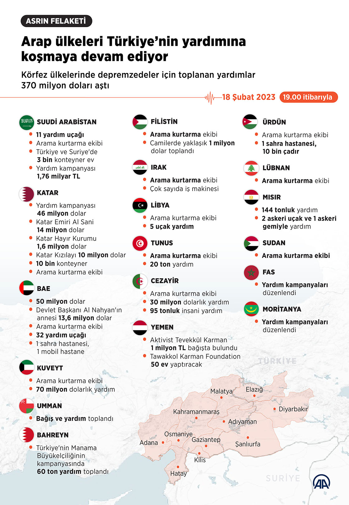 Deprem bölgelerine ilk günden itibaren arama kurtarma ekiplerini gönderen Arap ülkeleri, ayni ve nakdi yardımların yanı sıra başlattıkları kampanyalarla da depremzedelere destek veriyor.