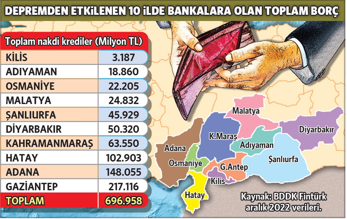 Bankacılık Düzenleme ve Denetleme Kurumu (BDDK), Kahramanmaraş merkezli toplamda 10 ili etkileyen depremlerden etkilenen vatandaşlar için mevcut ve yeni kredilerde 6 Şubat'tan itibaren 6 ay boyunca vade ve taksit kolaylığı imkanı tanıdı. Hazine ve Maliye Bakanı Nebati'nin de kredilerde ilave kolaylıklar sağlanacağını açıkladığı 10 ilin toplam kredi borcu 696 milyar 958 milyon lirayı buluyor. Takipteki kredileri de kapsayan toplam kredi yükümlülüğünün yüzde 67'si Gaziantep, Adana ve Hatay'a ait. 10 ilde, batık krediler olarak adlandırılan takipteki alacakların toplamı ise 17 milyar 972 milyon lirayı buluyor.
