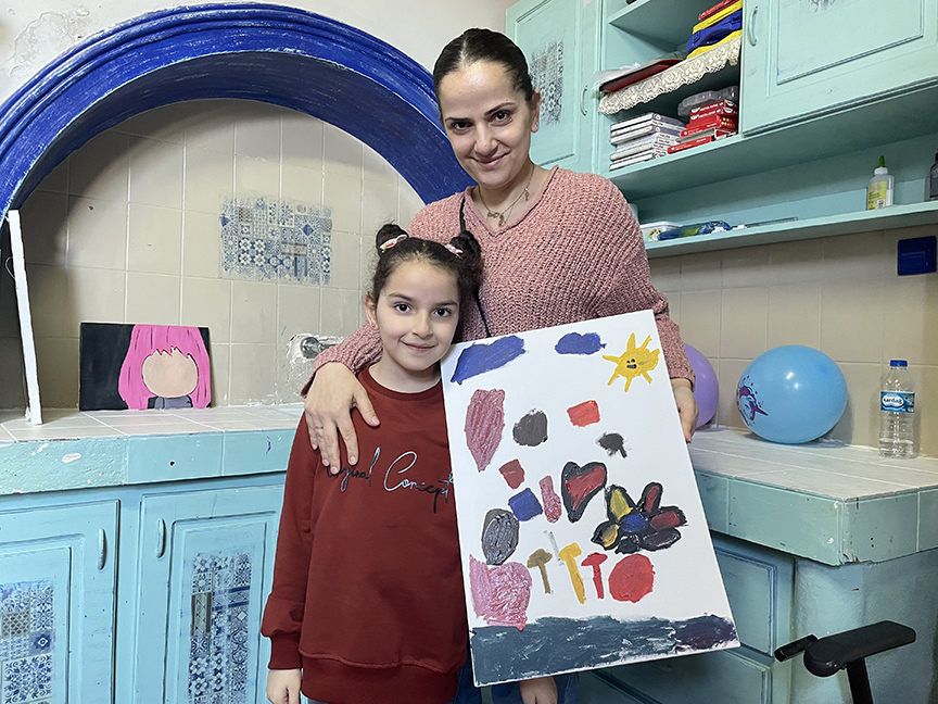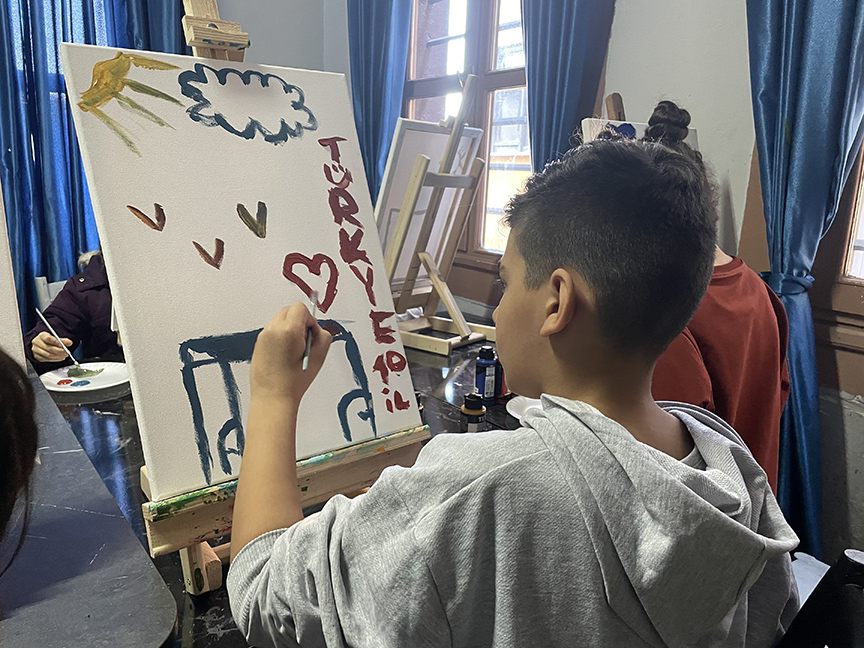 Resim öğretmeni Bediha Ertürk eşliğinde duygu ve hayallerini tuvale aktaran çocuklar, hem eğlenceli zaman geçiriyor hem de bu sayede depremde yaşadıklarını unutmaya çalışıyor.