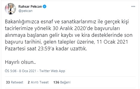 Ticaret Bakanı Ruhsar Pekcan, esnaf ve sanatkarlar ile gerçek kişi tacirlere kira yardımı yapılmasına yönelik düzenlemede son başvuru tarihinin 11 Ocak 23:59’a kadar uzatıldığını açıkladı. Kişisel sosyal medya hesabından bir açıklama yapan Ruhsar Pekcan, “Bakanlığımızca esnaf ve sanatkarlarımız ile gerçek kişi tacirlerimize yönelik 30 Aralık 2020’de başvuruları alınmaya başlanan gelir kaybı ve kira desteklerinde son başvuru tarihini, gelen talepler üzerine, 11 Ocak 2021 Pazartesi saat 23:59’a kadar uzattık” ifadesine yer verdi.
