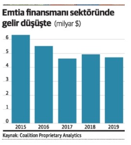 ABN Amro'nun sektörden çıktığını açıklamasının hemen ardından danışmanlık şirketi Coalition, emtia ticareti finansmanından elde edilen gelirin ikinci çeyrekte çok sert düştüğünü açıkladı. Coalition verilerine göre sektörün geliri geçen yılın aynı dönemine göre yüzde 40 azalarak 700 milyon dolara düştü. Danışmanlık şirketinin raporunda, emtia ticareti finansmanı gelirlerindeki düşüşün ikinci çeyrekte hızlandığı belirtilerek, yılın ilk yarısında gelirin yüzde 29 azalarak 1.7 milyar dolar olduğu kaydedildi. 2019 yılında gelir, yüzde 4 kayıpla 4.7 milyar dolar olarak gerçekleşmişti. Gelirde en büyük payı yüzde 61 ile EMEA (Avrupa, Ortadoğu ve Afrika) elde etti.
