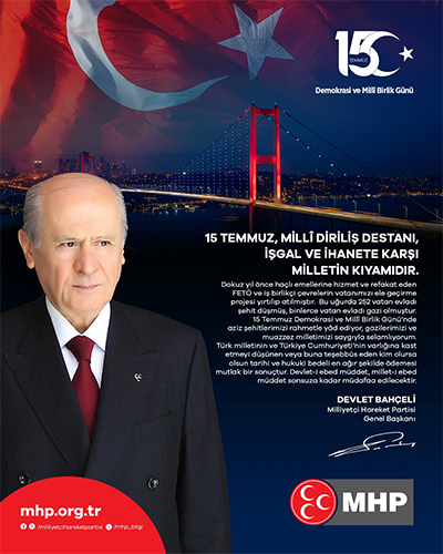 Bahçeli, açıklamasında, "Dokuz yıl önce haçlı emellerine hizmet ve refakat eden FETÖ ve iş birlikçi çevrelerin vatanımızı ele geçirme projesi yırtılıp atılmıştır. Bu uğurda 252 vatan evladı şehit düşmüş, binlerce vatan evladı gazi olmuştur. 15 Temmuz Demokrasi ve Millî Birlik Günü'nde aziz şehitlerimizi rahmetle yad ediyor, gazilerimizi ve muazzez milletimizi saygıyla selamlıyorum. Türk milletinin ve Türkiye Cumhuriyeti'nin varlığına kast etmeyi düşünen veya buna teşebbüs eden kim olursa olsun tarihi ve hukuki bedeli en ağır şekilde ödemesi mutlak bir sonuçtur. Devlet-i ebed müddet, millet-i ebed müddet sonsuza kadar müdafaa edilecektir” ifadelerine yer verdi.