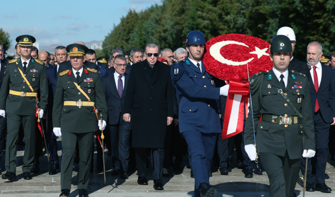 Cumhurbaşkanı Erdoğan'ın, üzerinde ay yıldız bulunan çelengi Atatürk'ün mozolesine bırakmasının ardından saygı duruşunda bulunuldu ve İstiklal Marşı okundu.