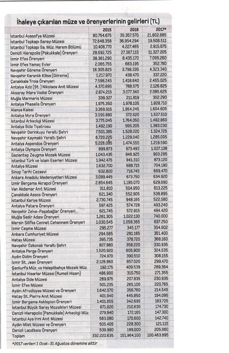 Sektör temsilcileri turizm sektörünün kriz öncesine dönmesi halinde müze ve örenyeri gişelerinin yeniden para basmaya başlayacağı görüşünde. Bakanlığa bağlı açık olan müze ve örenyerlerinin 2014 yılı geliri yıllık 345 milyon TL, 2015 yılı geliri yıllık 357 milyon TL düzeyindeydi. İhale dosyasında, müze ve örenyerleri toplam gelirin yüzde 90’ını sağlayan 53 müze ve örenyerinin 2015 yılı toplam geliri 332.2 milyon TL, 2016 yılı toplam geliri 151.96 milyon TL düzeyinde olduğu görülüyor. Söz konusu 53 müze ve örenyeri gişesinin 2017 yılı sekiz aylık geliri ise 100.5 milyon TL düzeyinde bulunuyor.