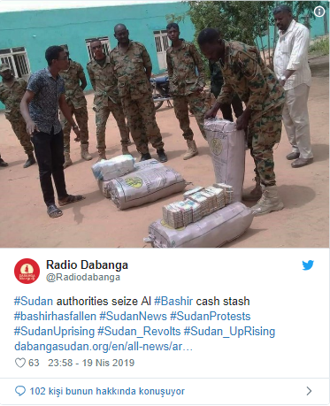 Reuters Haber Ajansına konuşan bir Sudanlı yetkili, El Beşir'in evinde 351 bin ABD doları, 6 milyon euro ve 105 milyon ABD dolarına denk gelen beş milyar Sudan Lirası dolu çuvallar bulunduğunu açıkladı.