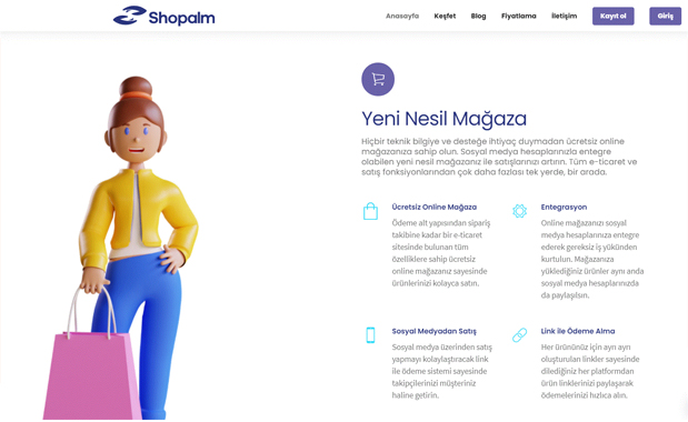 Güvenli ücretsiz online mağaza Shopalm, kolay kurulum, kişiselleştirme, sosyal medyadan satış, sosyal medya hesaplarıyla entegrasyon, çoklu platform, link ile ödeme alma, sanal POS gibi başlıklarda toplanan pek çok özelliğiyle firmaların ve bireysel satıcıların en büyük yardımcısı konumunda.