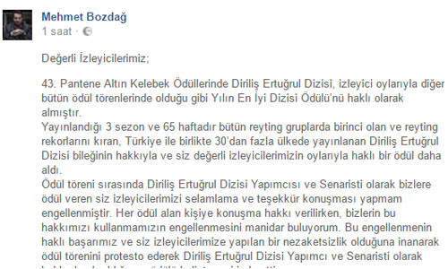 TRT'de yayınlanan ve büyük bir ilgiyle izlenen "Diriliş Ertuğrul" dizisi yapımcı ve senaristi Mehmet Bozdağ, "Yılın En İyi Dizisi" ödülünü aldıkları "43. Pantene Altın Kelebek Ödülleri" töreninde teşekkür konuşması yapmasının engellendiğini belirterek, "Bu engellenmenin haklı başarımız ve izleyicilerimize yapılan bir nezaketsizlik olduğuna inanarak, ödül törenini protesto ederek 'Diriliş Ertuğrul' dizisi yapımcı ve senaristi olarak haklı olarak aldığımız ödülü kuliste iade ettim." dedi.