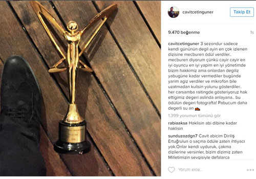 Okan Bayülgen'in bu konuşmasının ardından dizinin oyuncusu Cavit Çetin Güner'den İnstagram'dan tepki geldi. Güner ödülü ayakları altına aldığı fotoğrafı paylaştı.