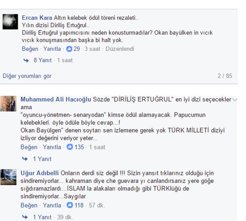 43. Pantene Altın Kelebek Ödülleri töreni protestoya sahne oldu. 'Yılın En İyi Dizisi' ödülünü kazanan "Diriliş Ertuğrul"un yapımcı ve senaristi Mehmet Bozdağ, teşekkür konuşmasına izin verilmeyince ödülü iade etti. Törenin sunucusu Okan Bayülgen'in dizi hakkındaki sözleri ve Bozdağ'a konuşma izni vermemesi sosyal medyada protesto edildi. Protestolar üzerine açıklama yapan Bayülgen suçu törende görevli hostese attı.