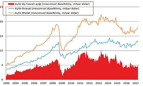 Grafiğin son aylarına baktığımızda, hem ihracatta hem de ithalatta 2017’nin başından itibaren belirgin bir artış trendi söz konusu. Her ne kadar mevsimselliğe göre düzeltilmiş verilerde Nisan ayı ihracatı yüzde 2.7 oranında düşmüş olsa da bu düşüşün genel bir trend olmadığı açık bir şekilde görülebiliyor. Aylık ortalama ihracat 12 milyar dolardan 13 milyar dolara yükselmiş durumda. Buna karşılık ithalattaki artış daha hızlı. Aralık ayında 16 milyar doların da altına inen aylık ortalama ithalat nisan ayı itibarıyla 18 milyar dolara yükselmiş durumda. Aylık ortalama verilerdeki bu farklılıklar, toplam dış ticaret açığını 20-25 milyar dolar artırabilir.