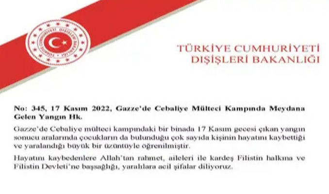 Bakanlıktan yapılan yazılı açıklamada, "Gazze'de Cebaliye mülteci kampındaki bir binada 17 Kasım gecesi çıkan yangın sonucu; aralarında çocukların da bulunduğu çok sayıda kişinin hayatını kaybettiği ve yaralandığı büyük bir üzüntüyle öğrenilmiştir. Hayatını kaybedenlere Allah'tan rahmet, aileleri ile kardeş Filistin halkına ve Filistin Devleti'ne başsağlığı, yaralılara acil şifalar diliyoruz" denildi.