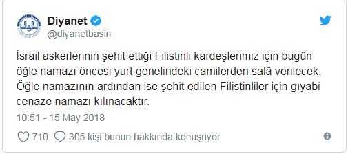 İsrail askerleri, ABD'nin Kudüs'te büyükelçilik açmasını protesto etmek için abluka altındaki Gazze sınırında düzenlenen gösterilere katılan 55 Filistinliyi şehit edip, yüzlercesi gerçek mermiyle olmak üzere 2 bin 771 Filistinliyi yaraladı. Diyanet İşleri Başkanlığı yetkililerinden alınan bilgiye, İsrail askerlerinin şehit ettiği Filistinliler için bugün öğle namazı öncesi yurt genelindeki camilerden sela verilecek. Öğle namazının ardından ise şehit edilen Filistinliler için gıyabi cenaze namazı kılınacak.