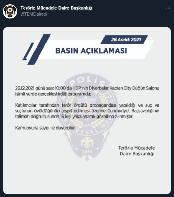 EGM Terörle Mücadele Daire Başkanlığı tarafından, HDP'nin Diyarbakır programıyla ilgili açıklama yapıldı. Twitter hesabından yapılan açıklamada, "26 Aralık 2021 günü saat 10.00'da HDP'nin Diyarbakır Kaplan City Düğün Salonu isimli yerde gerçekleştirdikleri programda; Katılımcılar tarafından terör örgütü propagandası yapıldığı ve suç ve suçlunun övüldüğünün tespit edilmesi üzerine Cumhuriyet Başsavcılığı'nın talimatı doğrultusunda 16 kişi yakalanarak gözaltına alınmıştır" ifadeleri kaydedildi.