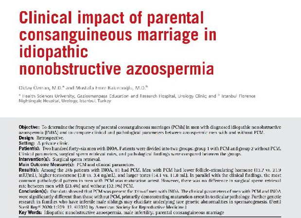 Üroloji ve Üreme Sağlığı Uzmanı Doç. Dr. Emre Bakırcıoğlu'nun sperm yokluğuna bağlı kısırlık (infertilite) sorunu olan 246 erkek hastayı incelediği araştırması, anne babası birinci dereceden akraba olan erkeklerin üçte birinde bu sorunun olduğunu ortaya koydu. Şimdiye dek hastaların yarısında nedeni bulunamayan sperm yokluğuna bağlı kısırlığın, aileden gelen genetik mutasyonlardan kaynaklı olabileceğini ilk kez gösteren bu çalışma, Amerikan Üreme Tıbbı Derneği'nin dergisinde de yayınlandı.
