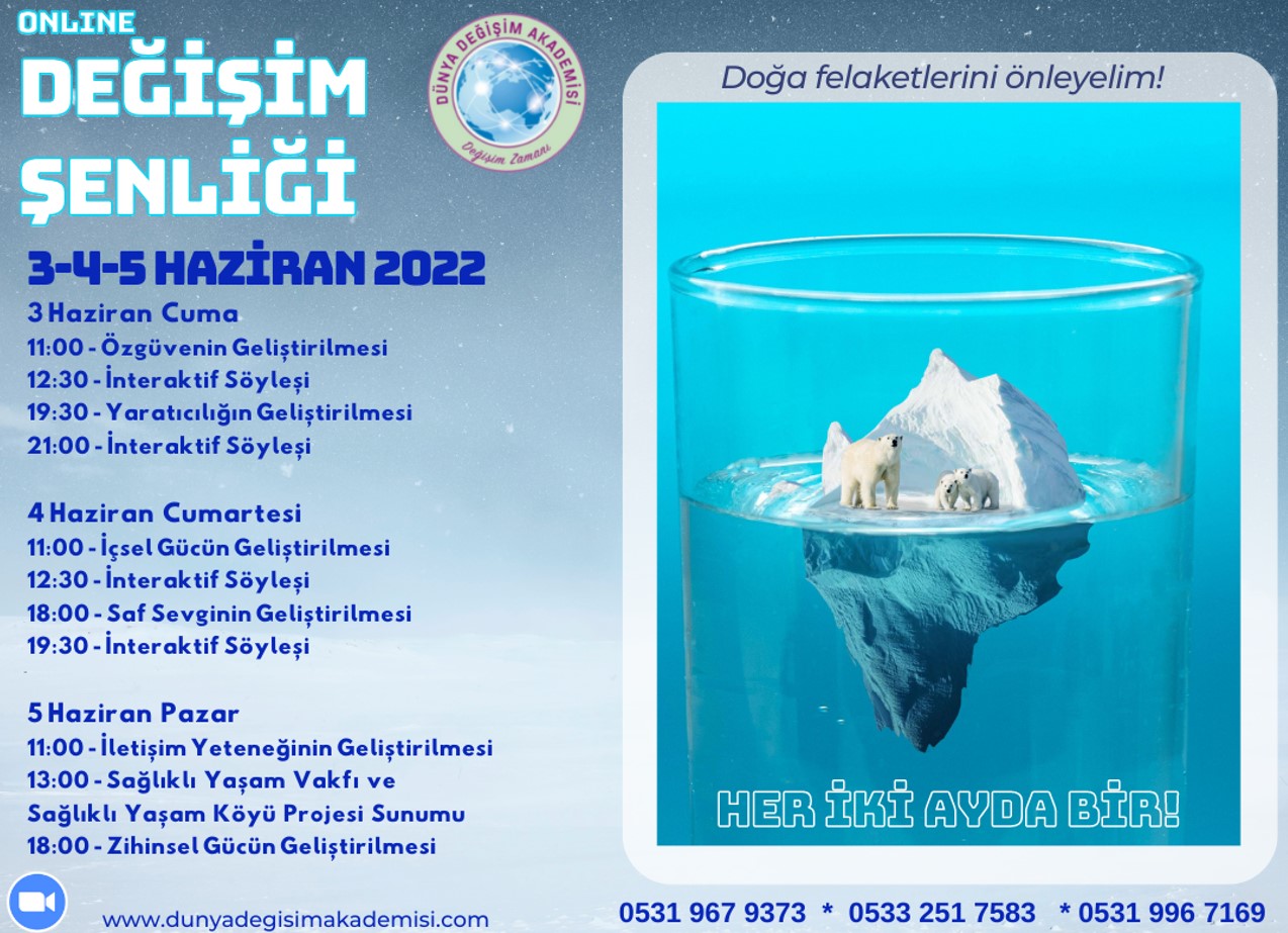 Online Değişim Şenliği’nde hem teorik hem pratik bilgilerin yanı sıra; herkesin evde kolaylıkla yapabileceği 6 enerji merkezi çalışmasına yer veriliyor. 3 gün boyunca online olarak devam edecek Değişim Şenliği’nde katılımcılara; nefes, biyoenerji, konsantrasyon, gevşeme alanlarında farkındalık çalışmaları sunuluyor. Altı temel enerji merkezini arındırmak ve aktifleştirmek için uygulanan tekniklerle, özgüven, yaratıcılık, içsel güç, saf sevgi, iletişim yeteneği ve zihinsel güç geliştiriliyor. Çalışmalar ilk kez katılacak olan katılımcılar için de uygun.