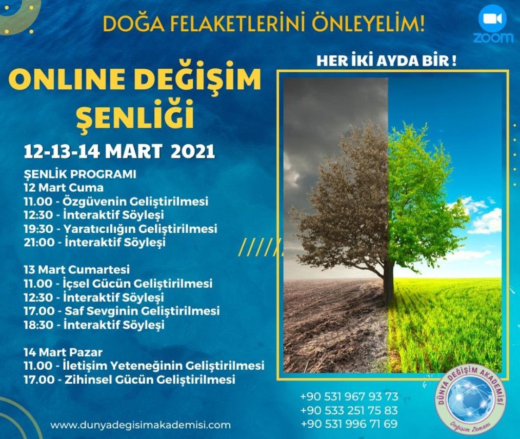 Online Değişim Şenliği’nde hem teorik hem pratik bilgilerin yanı sıra; herkesin evde kolaylıkla yapabileceği 6 enerji merkezi çalışmasına yer verilecek. 3 gün boyunca online olarak devam edecek Değişim Şenliği’nde katılımcılara; nefes, biyoenerji, konsantrasyon, gevşeme alanlarında farkındalık çalışmaları sunulacak. Altı temel enerji merkezini arındırmak ve aktifleştirmek için uygulanan tekniklerle, özgüven, yaratıcılık, içsel güç, saf sevgi, iletişim yeteneği ve zihinsel güç geliştirilecek. Çalışmalar ilk kez katılacak olan katılımcılar için de uygun.