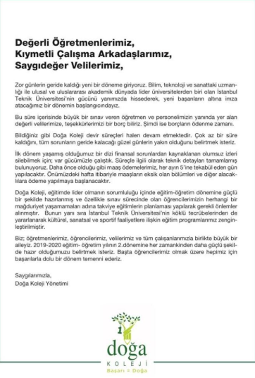 Doğa Koleji çalışanlarına gönderdiği mesajda düzenli maaş yatırma günlerinin ise her ayın 5'i olarak belirlendiği ifade edildi.