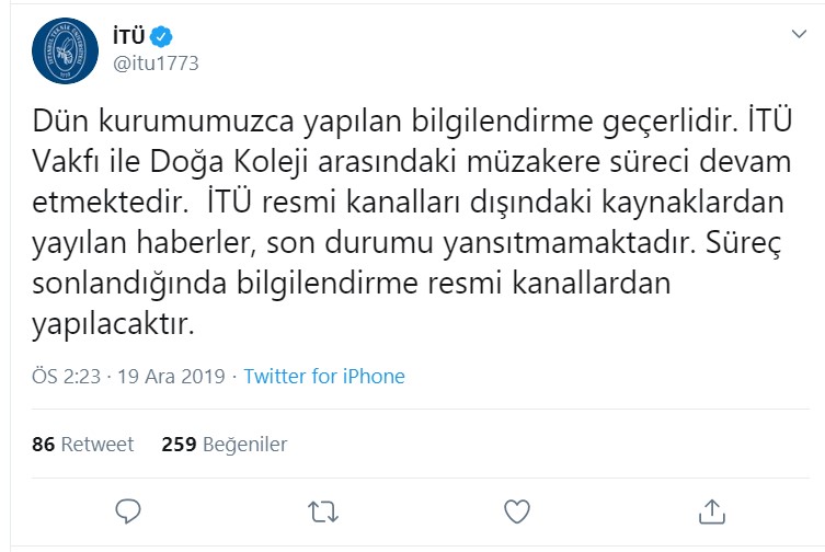 "Kriz bitti" mesajlarıyla sevinen öğretmen, veli ve öğrenciler, sosyal medyadan yapılan son duyuruyla hayal kırıklığına uğradı. Vakıf tarafından Twitter’da yapılan açıklamada, “Dün kurumumuzdan yapılan bilgilendirme geçerlidir. İTÜ Vakfı ile Doğa Koleji arasındaki müzakere süreci devam etmektedir. İTÜ resmi kanalları dışındaki kaynaklardan yayılan haberler son durumu yansıtmamaktadır. Süreç sonlandığında bilgilendirme resmi kanallardan yapılacaktır” denildi.