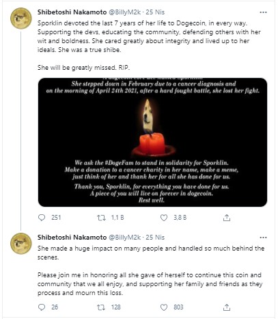 Yaşamının son 7 yılını DogeCoin'in geliştirilmesinde harcayan ve kadın geliştiricilerin örnek aldığı isimler arasında yer alan Sporklin'in Cumartesi günü bir süredir mücadele ettiği kanser hastalığına yenik düştüğü duyuruldu.