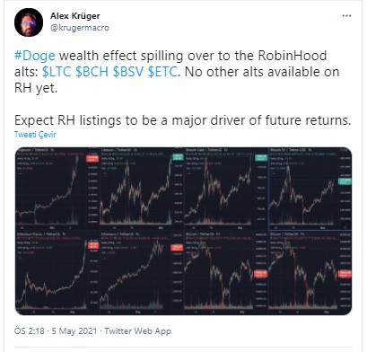 Gerçekten de 5 Mayıs'ta Robinhood'da listelenen tüm büyük kripto paralar, DOGE yüzde 25 değer kaybederken çift haneli artışlar gösterdi.
