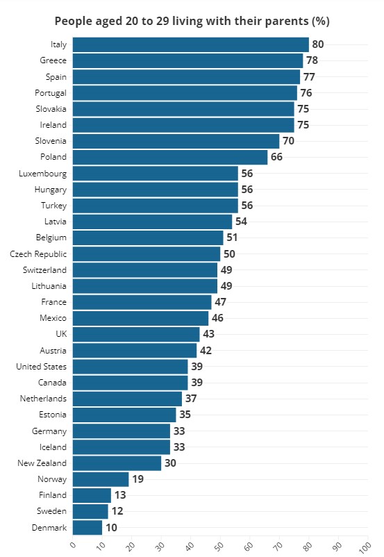 (Grafik, 20-29 yaş arası gençlerin aileleriyle birlikte yaşama oranlarını ülkeler arasında karşılaştırıyor.)