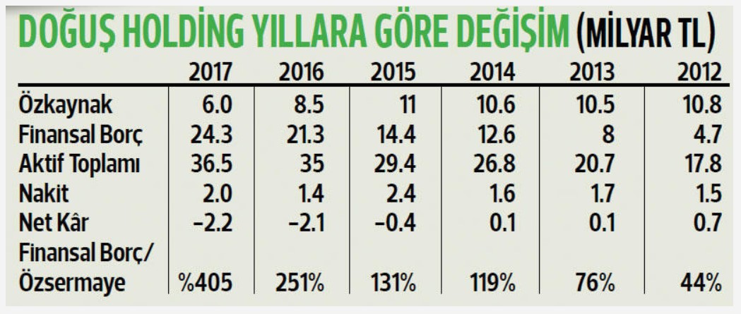 Doğuş Holding, KAP’a yaptığı açıklamaya göre 2017 yılında 2.2 milyar lira zarar etti. Ayrıca 2017 yılında 1.25 milyar lira net faiz öderken 1.13 milyar lira da net kur farkı gideri yazdı. Toplam ana ortaklığa ait özkaynakları 2016 sonunda 8.4 milyar lira iken 2017 sonunda 6 milyar liraya indi. Holding faaliyetlerinden ise 20.3 milyar lira satış hasılatı elde etti. Holding, KAP’taki açıklamasına göre inşaat, otomotiv, turizm, medya, enerji, gayrimenkul, yeme-içme-eğlence ve diğere alanlarda faaliyet gösteriyor. Çalışan sayısı da 2016 sonunda 45 bin 108’den 2017 sonunda 25 bin 222’ye indi. 31 Aralık 2017 itibariyle, Doğuş Holding’in ödenmiş sermayesi 856 milyon 27 bin lira.