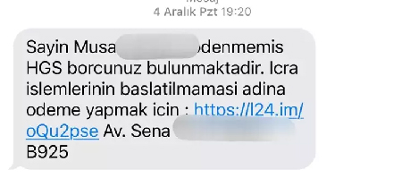 Son aylarda siber dolandırıcılar, sahte avukat ismi kullanarak Hızlı Geçiş Sistemi (HGS) ve İSPARK kullanıcılarına SMS atarak vatandaşları ağlarına düşürmeye çalışıyor. ‘Ödenmemiş HGS Borcunuz var, icra işlemlerinin başlatılmaması adına ödeme yapmanız gerekiyor’ şeklinde sahte avukat ismiyle gelen mesajlar kullanıcıları mağdur ediyor. Gönderilen SMS’te kişilere ödenmemiş borcu olduğu belirtilirken, mesajda bulunan linke tıklayarak ödeme yapması isteniyor. Linke tıklanmasıyla birlikte kurumun resmi sayfasının bir benzeri kullanıcının karşısına çıkıyor. Sahte sayfayı fark etmeyen mağdurlar kimlik bilgileri ve ödeme yapmak için kullandıkları kredi kartı bilgilerini sayfaya girmesiyle birlikte dolandırılıyor. Uzmanlar ise bu tarz mesajları alan kişilerin linke tıklamadan bahsi geçen kuruma telefon açarak veya resmi internet sitesine girerek borçlarını sorgulaması gerektiğini söylüyor.
