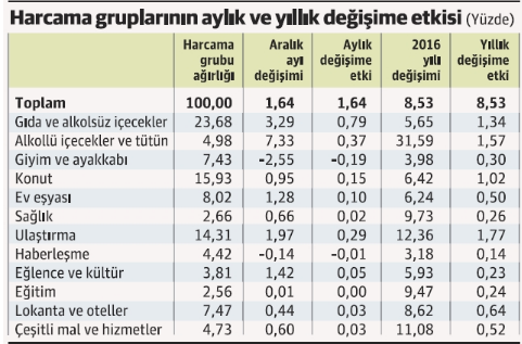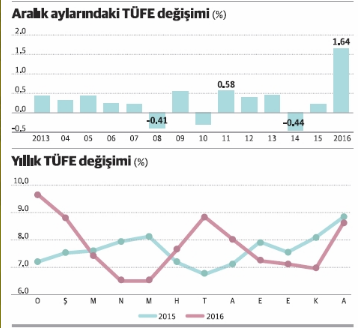 Kasım sonu itibariyle yüzde 7'ye gerileyen ve yıllık hedef ve tahmin olan yüzde 7.50'de kalınacağı yönündeki umutların artmasını sağlayan gidişat da aralık ayındaki bu rekor oranla birlikte bir anda değişti. 2016 yılının TÜFE artışı yüzde 8.53 düzeyine çıktı. Yani yıllık yüzde 7.50'lik hedef ve daha sonra aynı düzeyde ifade edilen yıllık tahmin, bir puanın üstünde aşılmış oldu.