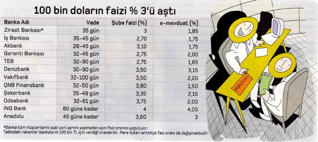 Banka şubelerindeki müşteri ilişkileri yöneticileri ise döviz tevdiat hesabı açtırmak isteyen müşterilerine Türk Lirası mevduatı öneriyor. Son 15 günde TL mevduat faizlerinde bazı bankalarda bir puanı aşan yükselişler yaşanması yüzünden 90 güne kadar olan mevduatların faiz oranları da sektör genelinde yüzde 14'lere kadar çıkmış durumda. Hatta bu seviyeleri büyük bankalar da telaffuz etmeye başladı. Geçmiş dönemlerde bir ay ile sınırlı olan vadeler ise 90 gün hatta 120 güne kadar uzadı.