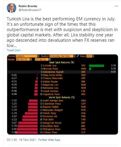 Uluslararası Finans Enstitüsü (IIF) Başkanı Robin Brooks, Twitter’dan gelişen piyasa (EM) para birimlerinin temmuz ayının başından bu yana dolar karşısındaki performanslarının yer aldığı bir Bloomberg grafiği paylaşarak, Türk Lirası’nın yüzde 2,10’luk yükselişle, en iyi performansı sergileyen EM parası olduğunu vurguladı.