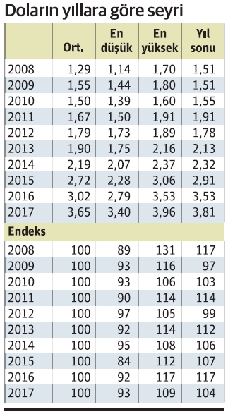Dolar geçen yılın tümünde 3.40 lira ile 3.96 lira arasında dalgalandı. Yıllık ortalama 3.65 oldu, yıl da 3.81 düzeyinden kapatıldı.