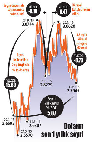 -Bitişikteki grafikten de izlenebileceği gibi, dolara ne olduysa geçen yılın temmuz ortasında oldu. 2.63’ten başlayan çıkış eylül sonuna kadar sürdü ve 3.0744 ile son buldu. Kur 2 ay 10 gün gibi bir sürede yüzde 17 arttı. Hükümetin kurulamaması, Güneydoğu terör olaylarının patlak vermesi, arkasından yeni bir seçime gidilmesi gibi iç olaylar da destekledi bu yükselişi ama asıl sürükleyici olan dışarısıydı. Hatta temmuz ortasında patlak veren Çin Borsası’ndaki sert satışlardı.