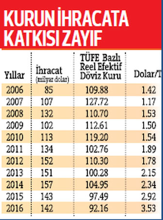 Döviz kurlarındaki artışın ihracat üzerindeki etkisi tartışma konusudur. Doğal olarak kur artışının ihracata olumlu etkisi beklenir. 2006-2016 gerçekleşmelerine bakıldığında bu varsayımın çok doğru olmadığı görülüyor. Veya kur artışının ihracatı artırmaya yetmediği sonucuna varılabilir.