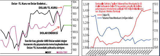Dolar/TL kurunda çıkış trendi devam ediyor. Uzun dönem trend direnci 3.64 olarak görülüyor. Bu seviyenin üzerinde yükselişin devamıyla birlikte 3.70-3.75 ve 3.80 sonraki direnç seviyeleri. Geri çekilmelerde ilk destek noktaları ise 3.58-3.55 seviyelerinde. Direnç seviyelerinde kâr satışları görülse de çıkış hareketi gücünü koruyabilir.